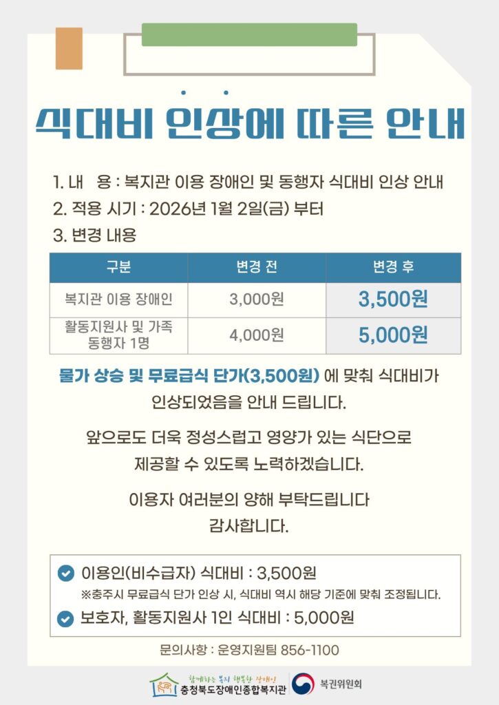 충청북도장애인종합복지관 조리보조원 채용 재공고