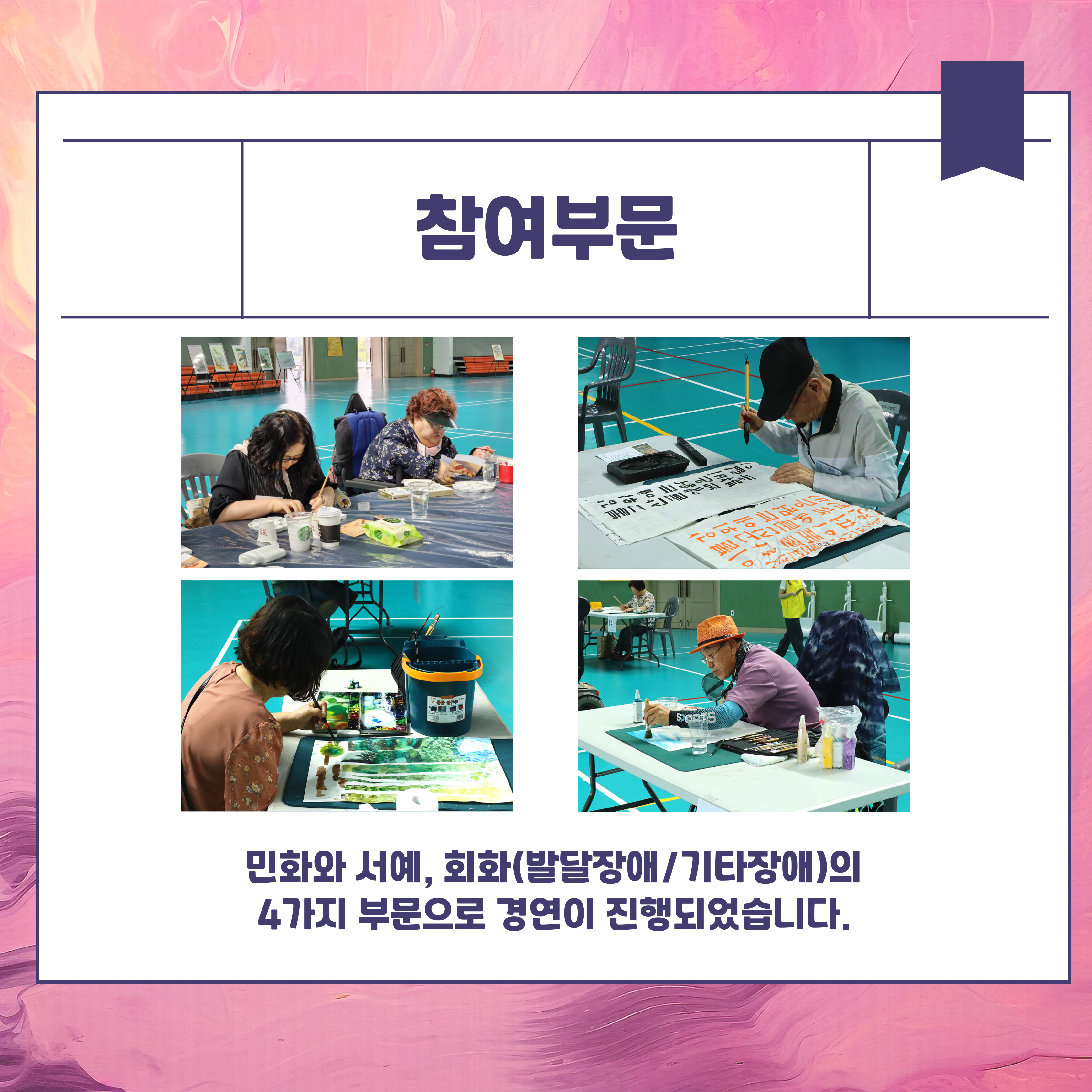 민화와 서예, 회화(발달장애/기타장애)의 4가지 부문으로 경연이 진행되었습니다.