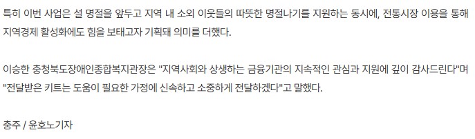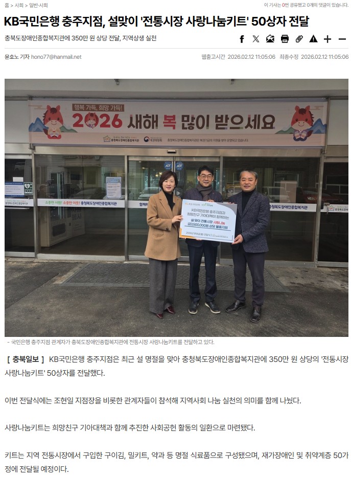 KB국민은행 충주지점, 설맞이 '전통시장 사랑나눔키트' 50상자 전달