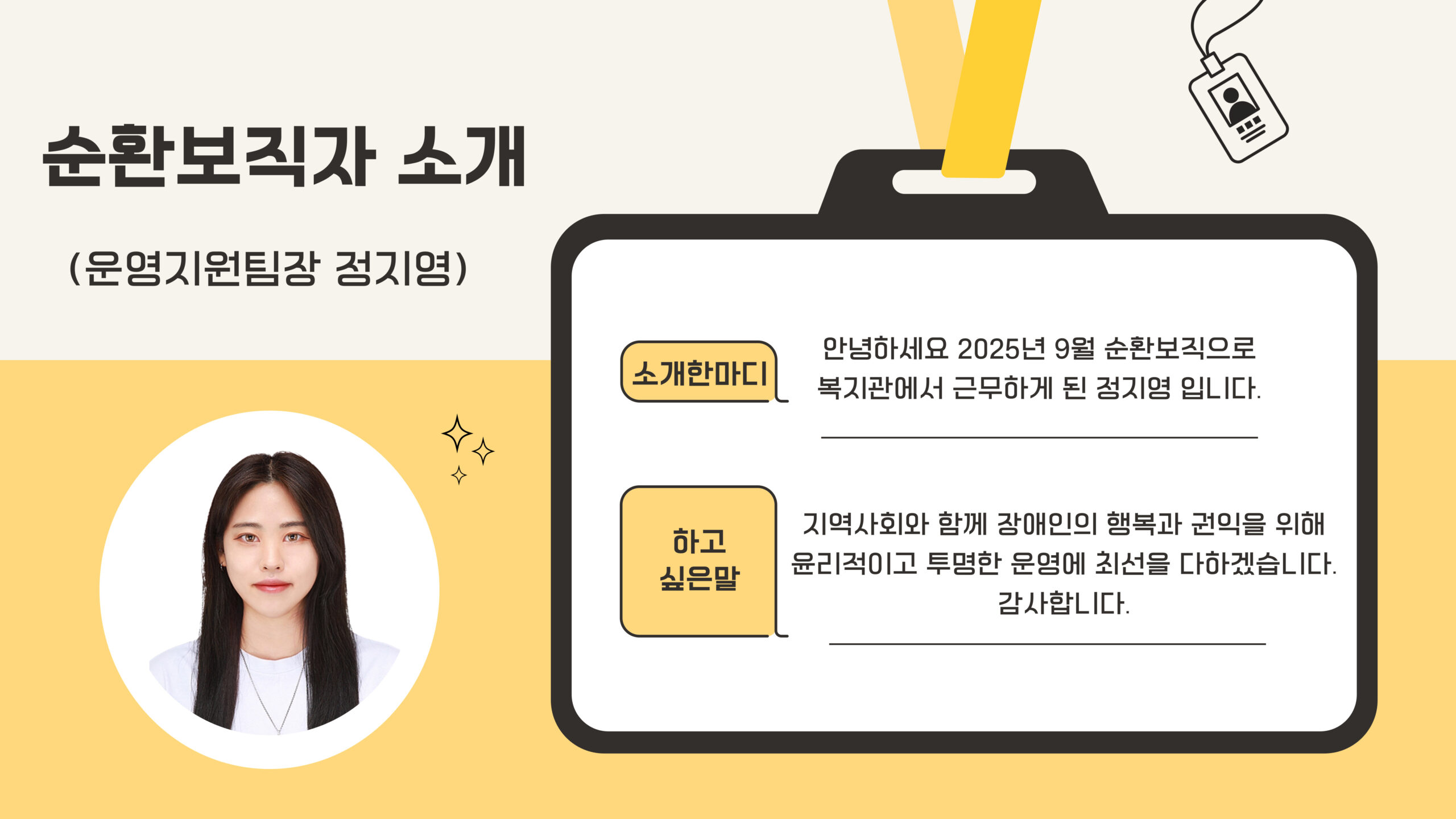 안녕하세요 2025년 9월 순환보직으로 복지관에서 근무하게 된 정지영 입니다.