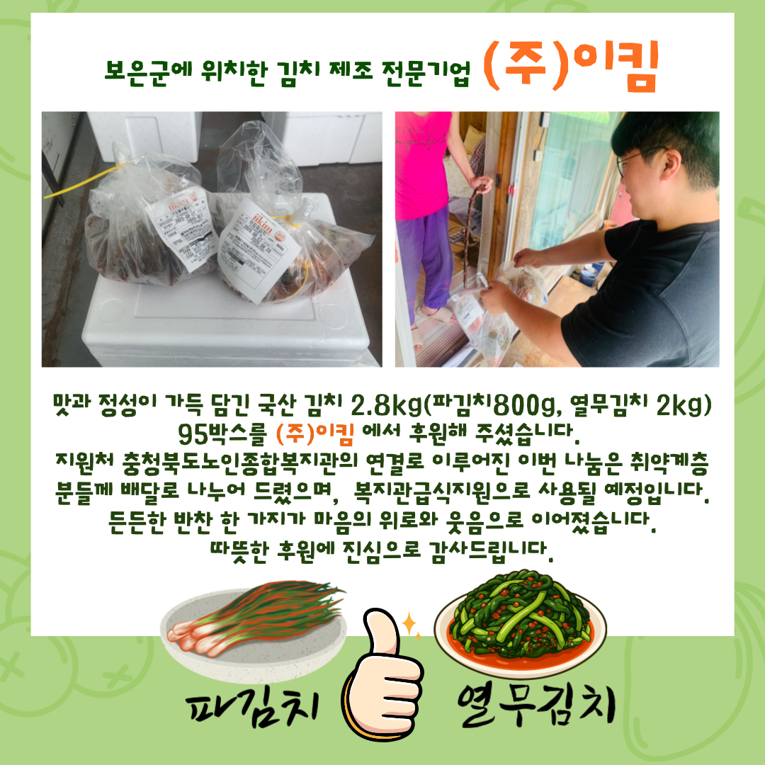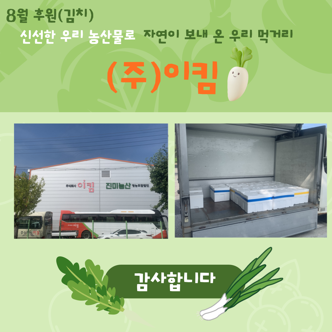 8월 28(목) (주)이킴에서 정성 어린 국산 김치 2.8kg (파김치 800g, 열무김치 2kg) 95박스를 후원해 주셨습니다.