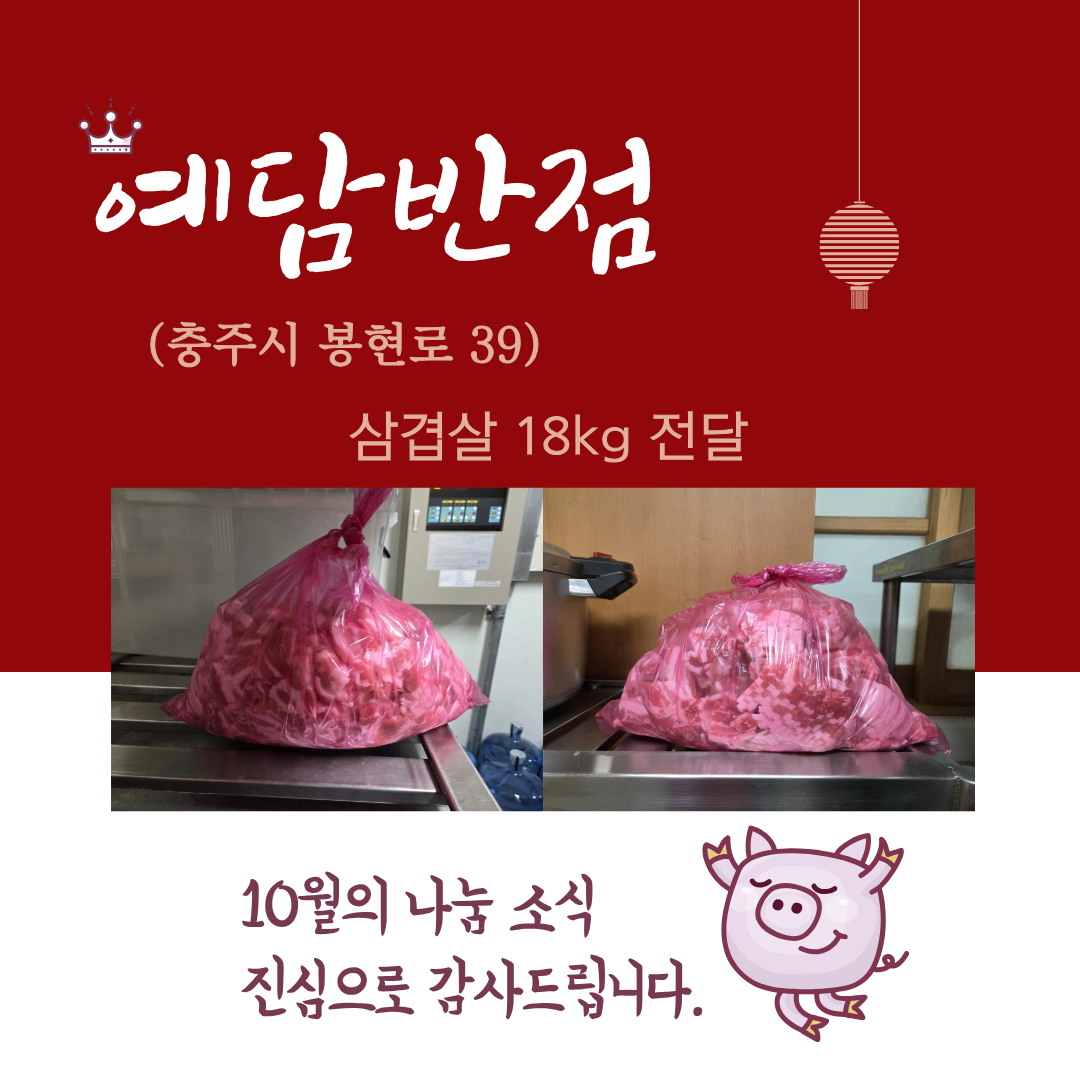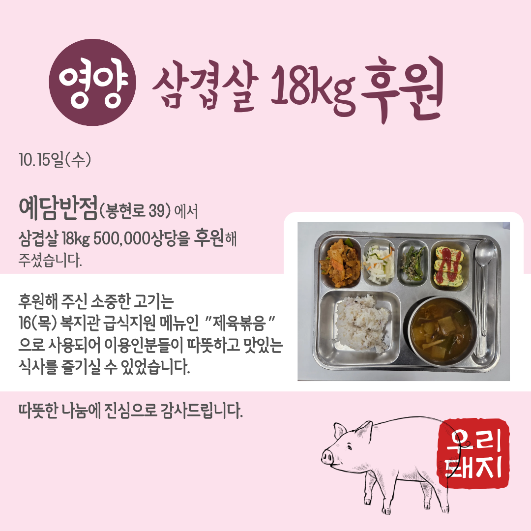 삼겹살 18kg, 500,000원 상당을 전달해 주셨습니다.