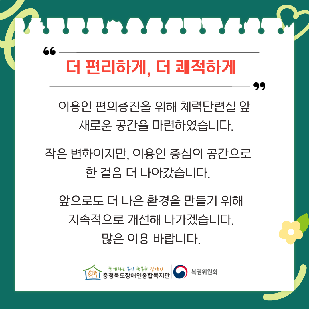 작은 변화지만 이용자 중심의 공간으로 한 걸음 더 나아갔습니다. 앞으로도 더 좋은 환경을 만들기 위해 지속적으로 개선해 나가겠습니다. 많은 이용 바랍니다