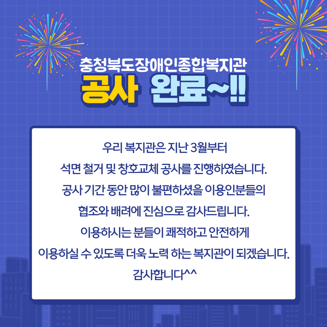 장애인 재활과 지역사회의복지증진을 위해 충청북도장애인종합복지관이 함께 하겠습니다.