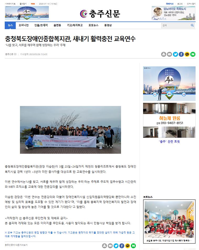 충청북도장애인종합복지관(관장 이승한)이 3월 23일 ~ 24일까지 제천의 청풍리조트에서 충청북도장애인복지시설 경력 1년차 ~ 3년차 미만 종사자를 대상으로 한