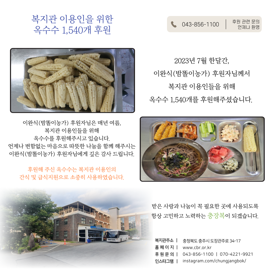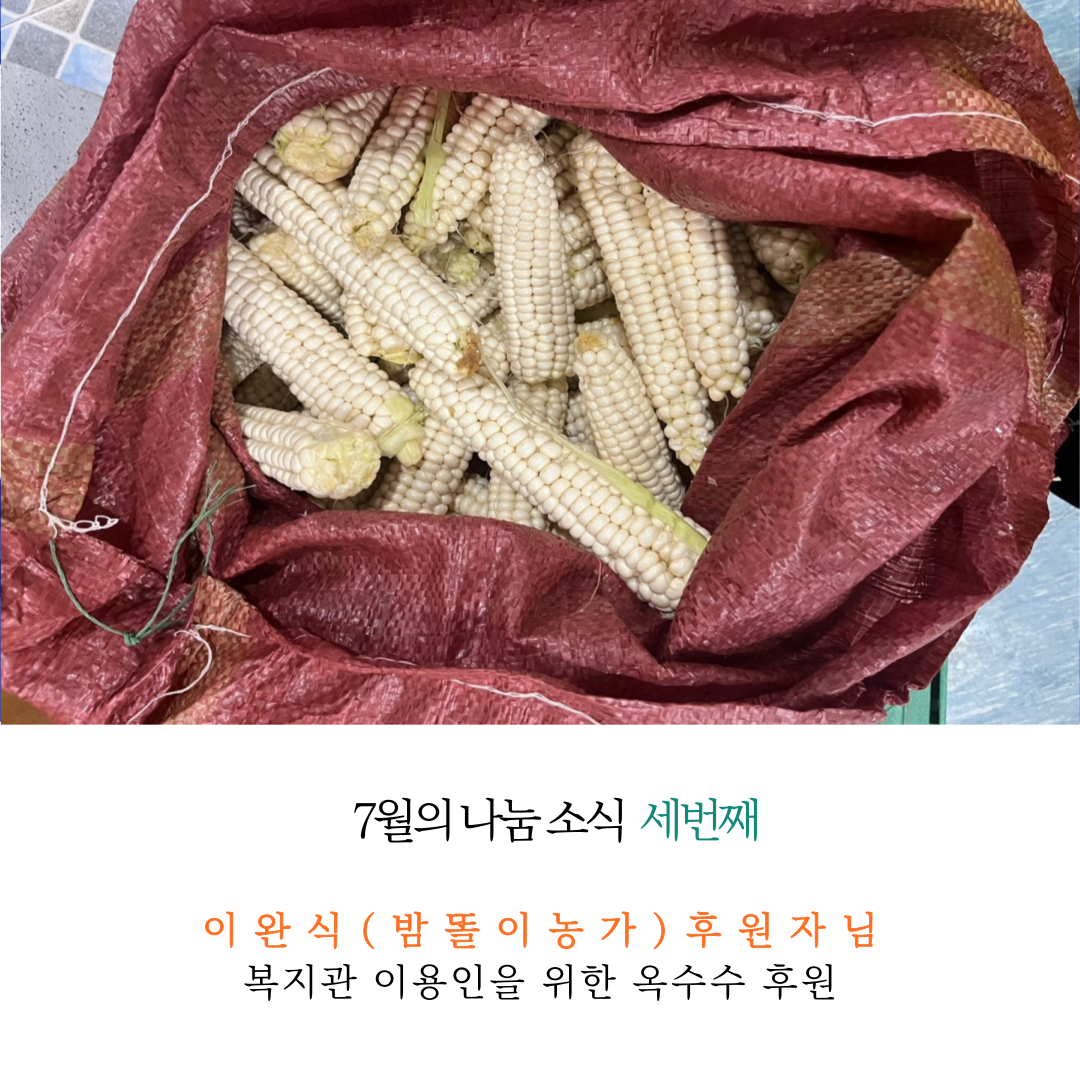 2023년 7월 한달간, 이완식(밤똘이농가) 후원자님께서 복지관 이용인들을 위해 옥수수 1,540개를 후원해주셨습니다.